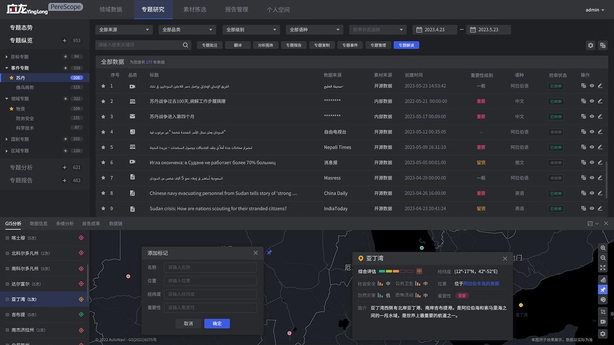 The system evaluates the overseas security risk situation from a fair, objective and independent Chinese perspective, and provides real-time security risk warnings to overseas Chinese institutions and overseas Chinese people by aggregating and analyzing elemental information of security risk events in different countries and regions to reduce security risks and losses caused to major Chinese projects and raise the security awareness of overseas Chinese personnel.
